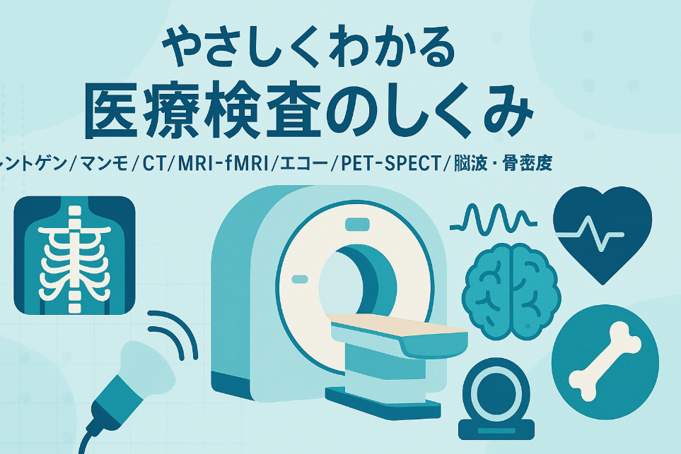 レントゲン/マンモグラフィ/CT/MRI・fMRI/超音波(エコー)/SPECT・PET/脳波/骨密度/カロリックテスト