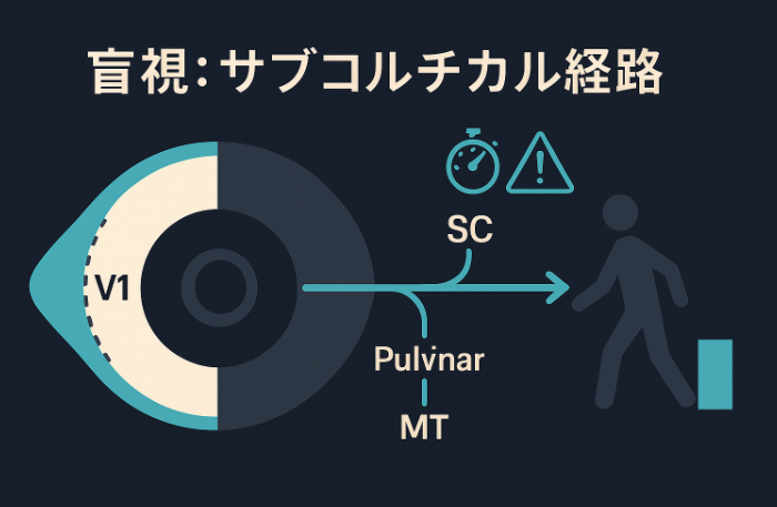 サブコルチカル経路は、速いけれど粗い。精密な色や細部の認知は苦手でも、動き・位置・危険のサインには強い。V1が停止しても、SC→Pulvinar→MT/扁桃体というバイパスは**“間に合わせの安全運転”を走らせられます。